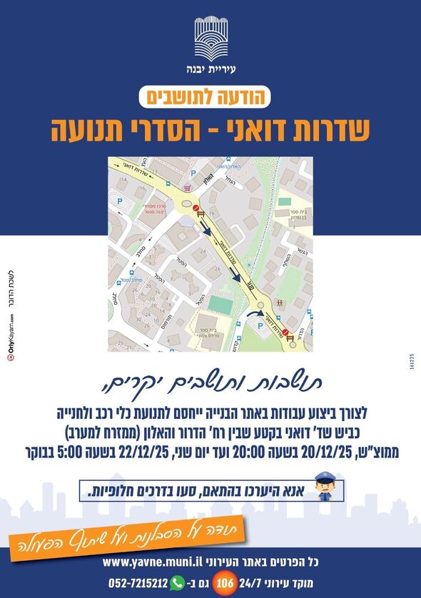 שינויים בהסדרי התנועה ביבנה: שדרות דואני ייחסמו לתנועה ולחנייה בקטע שבין רחוב הדרור והאלון החל ממוצ"ש 20.12
