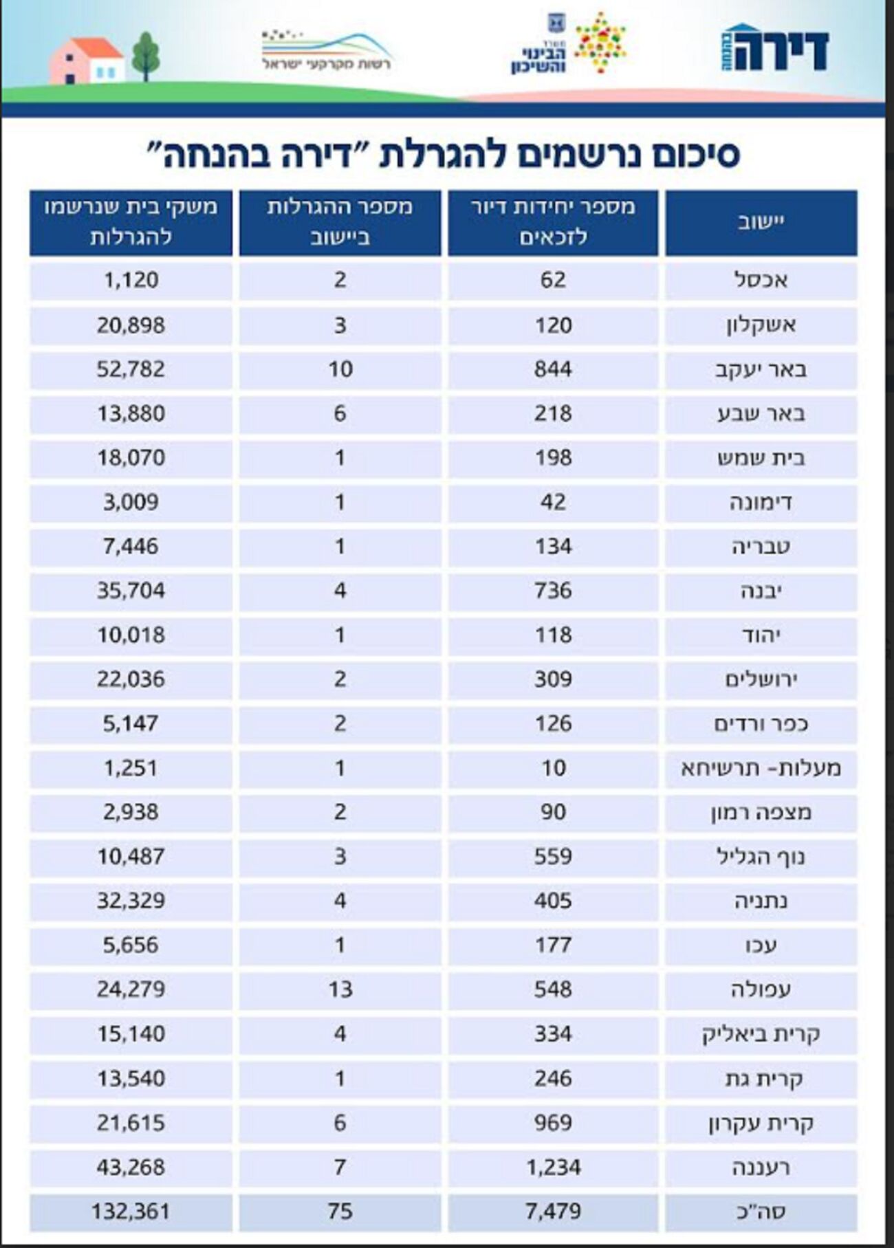 בסך הכול נרשמו 132,361 משקי בית – נתון המהווה את מספר הנרשמים הגבוה ביותר מאז השקת תוכנית "דירה בהנחה", עם מאות אלפי הרשמות ביישובים השונים, מאחר שכל זכאי רשאי להירשם לעד שלושה יישובים ולכל ההגרלות המתקיימות בהם. (מצורפת הרשימה המפורטת)