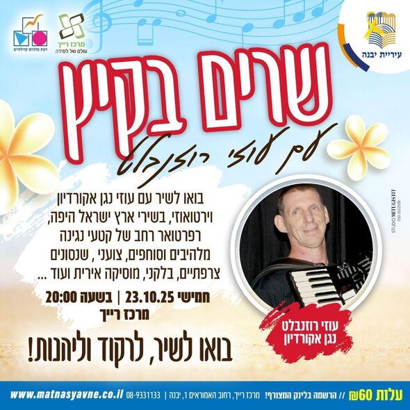 עיריית יבנה מזמינה: ערב שירה בציבור "שרים בקיץ עם עוזי רוזנטל" יתקיים מחר חמישי 23.10.2025 במרכז רייך