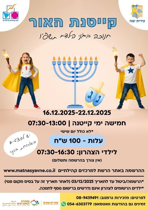 נפתחה ההרשמה לקייטנות חנוכה לילדי הגנים ובתי הספר ביבנה