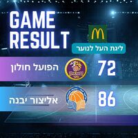קבוצת נוער על של אליצור יבנה רשמה ניצחון חוץ גדול על הפועל חולון בתוצאה 86:72. המשחק, שהתקיים אמש, היה צמוד במחצית הראשונה, אותה סיימו חניכיו של המאמן חי דוידי בפיגור של 3 נקודות.