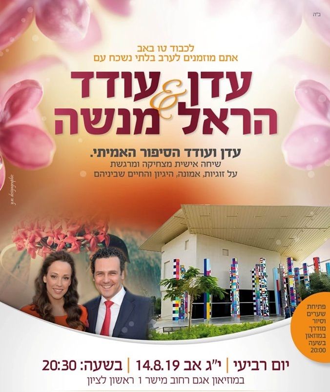 בני הזוג עדן הראל ועודד מנשה מגיעים למופע ט"ו באב שיתקיים ביום רביעי 14.8 במוזיאון אגם ראשון לציון