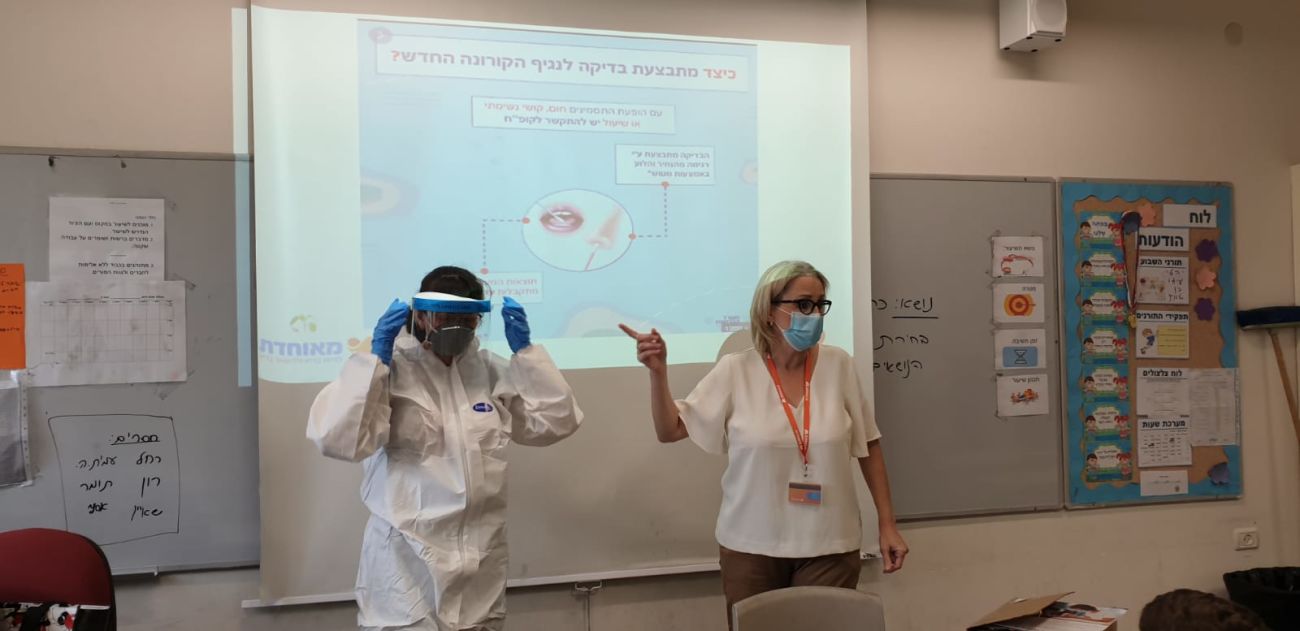 מדובר ביוזמה של מנהלת המרכז הרפואי 'מאוחדת קדמת ראשון', רוני יזרסקי בשיתוף מנהלת הסיעוד במרכז הרפואי, אנה קריץ. השתיים יצרו שיעור חווייתי, חילקו לתלמידים עלונים עם מילון קורונה, הקרינו את סרטון הפרסומת של משרד הבריאות, הדגימו כיצד מתבצעת בדיקת קורונה עם חליפת ואמצעי מיגון והשיבו לשאלות התלמידים הסקרנים.
