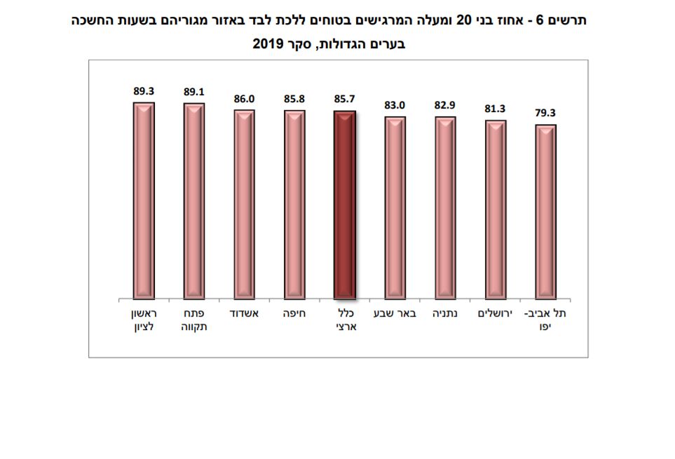 כך עולה מנתוני הסקר הביטחון האישי של הלמ"ס לשנת 2019. הנתונים מראים כי קרוב ל90% מתושבי ראשון לציון מרגישים בטוחים ללכת לבד בחשיכה.