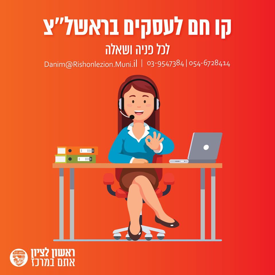 בנוסף מעמידה העירייה לרשות בעלי העסקים קו חם לכל שאלה ופנייה: 03-9547384, 054-6728414, 054-6728495 או למייל asakim@rishonlezion.muni.il