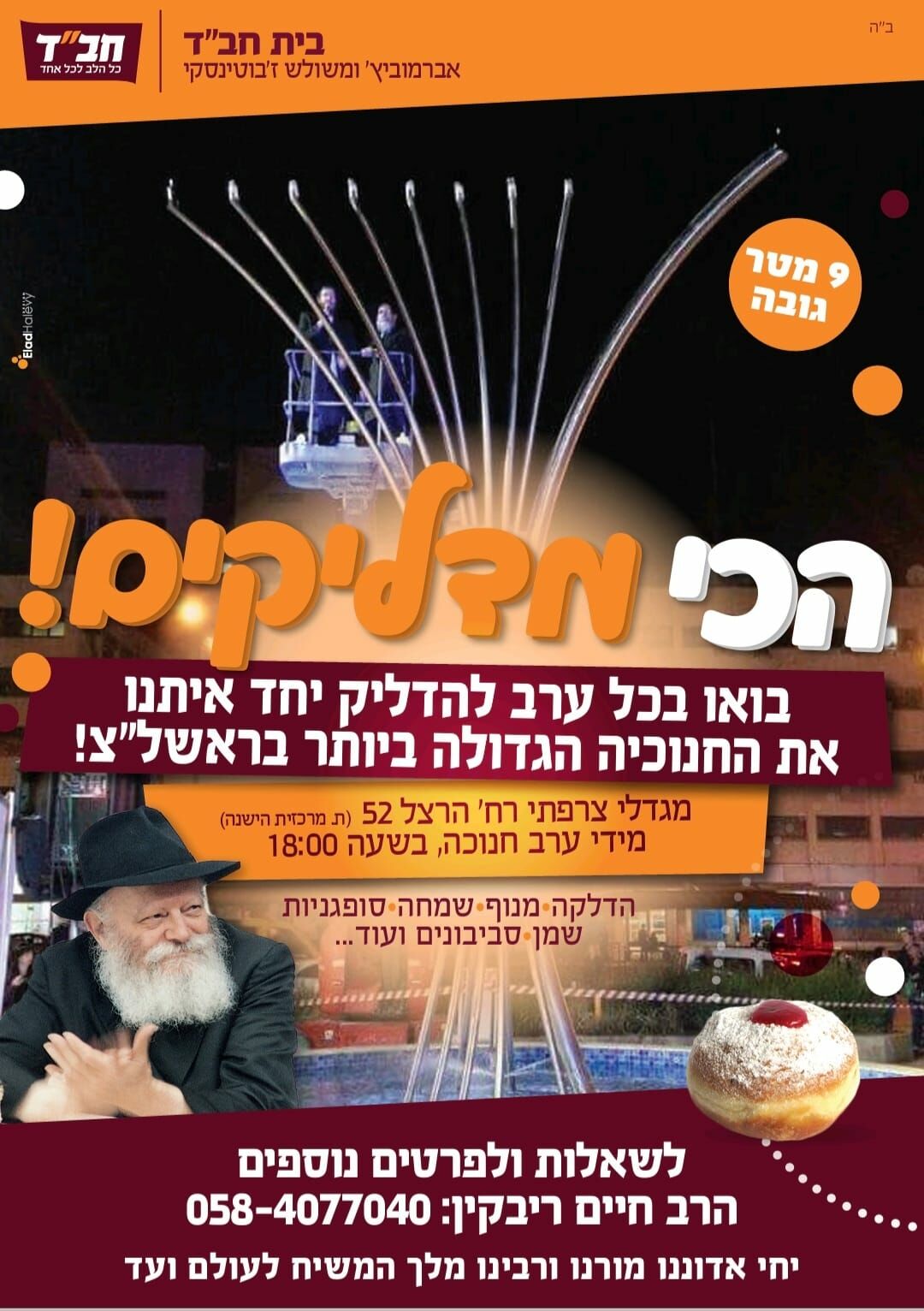 חגיגות חנוכה במתחם התחנה המרכזית הישנה בראשון לציון חוזרות עם טקסי הדלקת הנרות של הרב חיים ריבקין בחנוכיית הענק המוצבת במקום