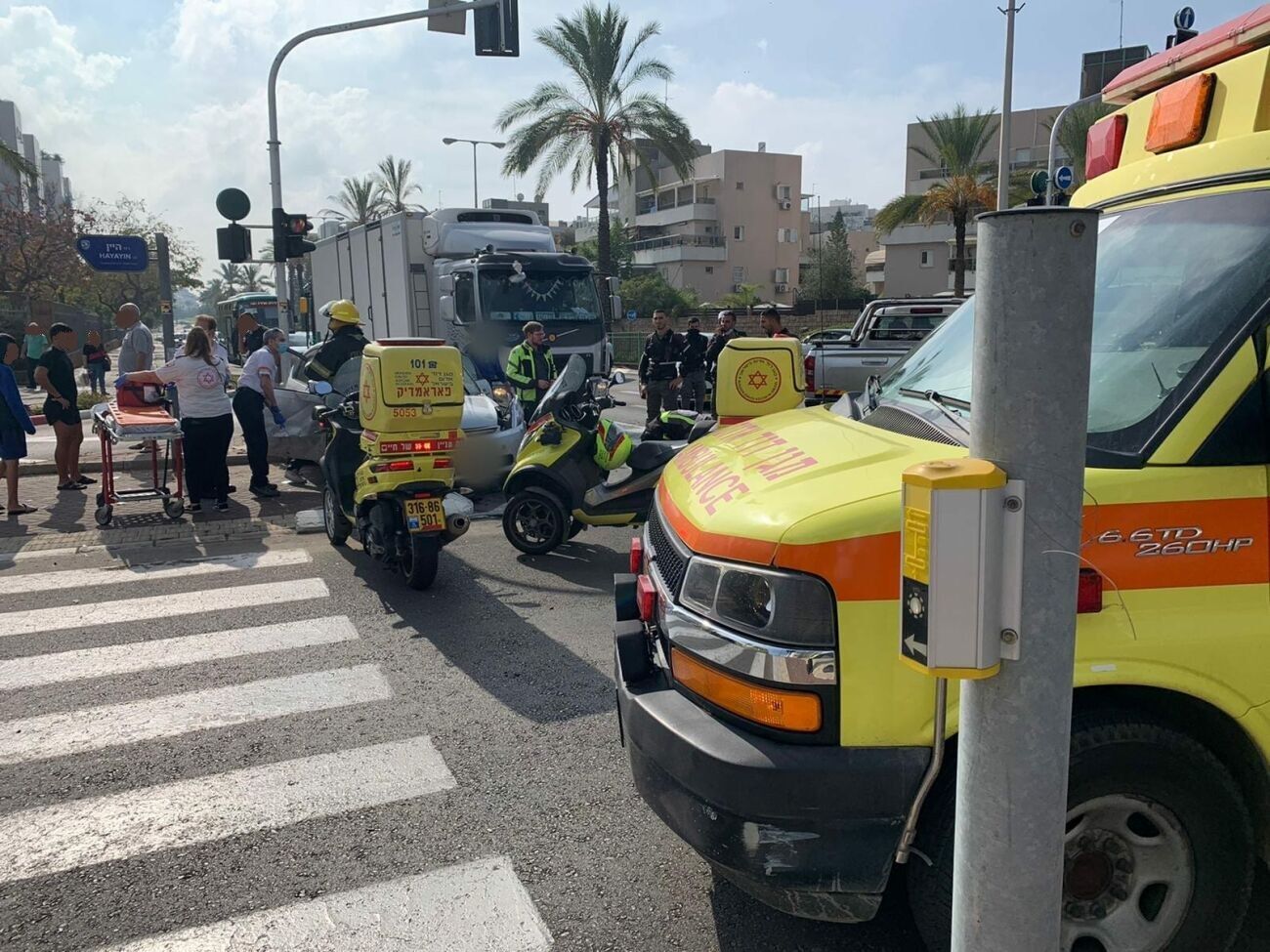 "נהג אחד מהרכבים נלכד ברכב כשהוא בהכרה וסובל מחבלת ראש. בסיוע כוחות הכיבוי חילצנו אותו תוך כדי טיפול רפואי ופינינו אותו לבית החולים כשמצבו בינוני. רוכב האופנוע ששכב על הכביש והנהג השני שנפגעו באורח קל טופלו במקום התאונה ופונו גם כן לבית החולים כשמצבם יציב."