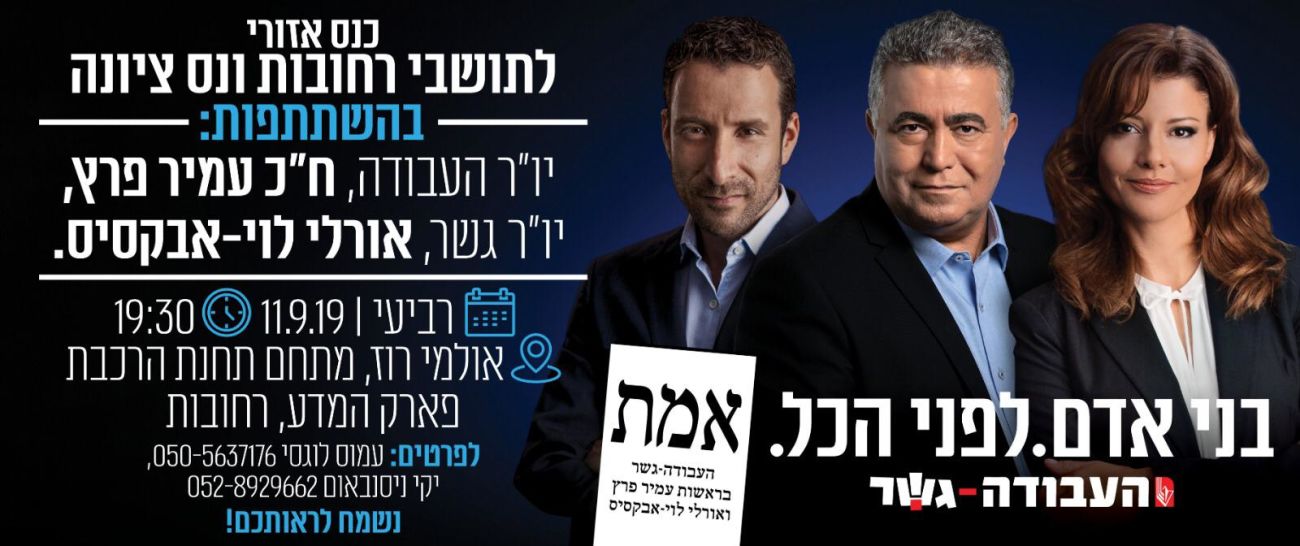 מחר רביעי 11/9 בשעה 19/:30 יגיעו ראשי מפלגת העבודה עמיר פרץ, אורלי לוי אבקסיס ואיציק שמולי לכנס ברחובות אשר ייערך באולמי רוז הנמצאים במתחם תחנת הרכבת (צמוד למלון לאונרדו).