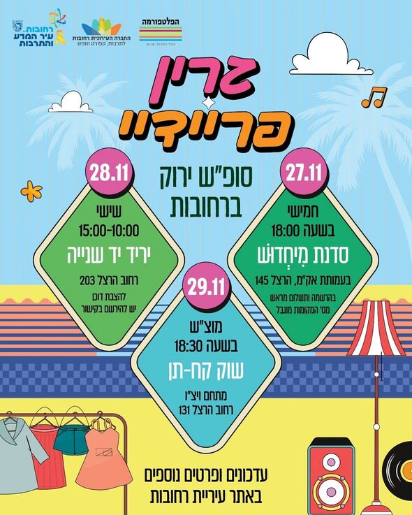 למחרת, יום שישי, 28.11, יתקיים יריד יד שנייה גדול בין השעות 10:00 ל-15:00 ברחוב הרצל 203. היריד יציע למעלה מ-20 דוכנים שיכללו בגדים, תיקים, כלי בית, תכשיטים ואביזרים שונים. המעוניינים להציב דוכן ביריד מתבקשים להירשם מראש בקישור: https://forms.office.com/r/DJgWd5ucLG.