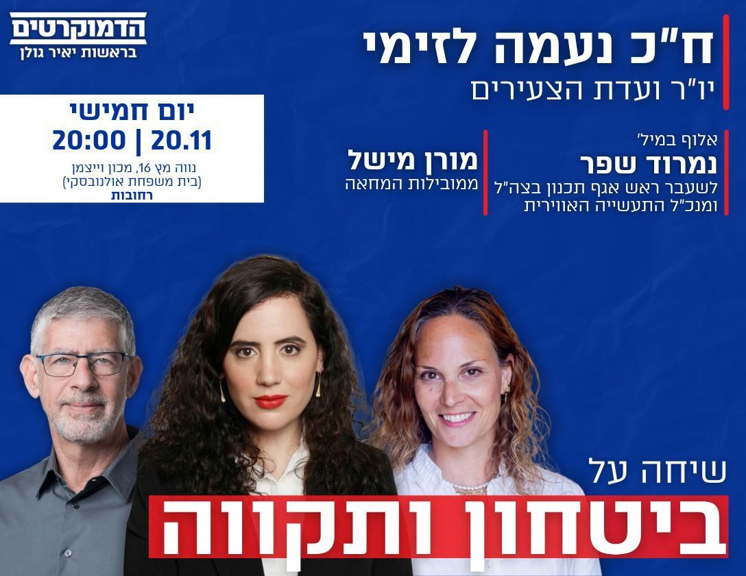 ההשתתפות באירוע מותנית בהרשמה מראש בקישור הבא: https://e.democrats.org.il/Democrats_OpenHouses/232187