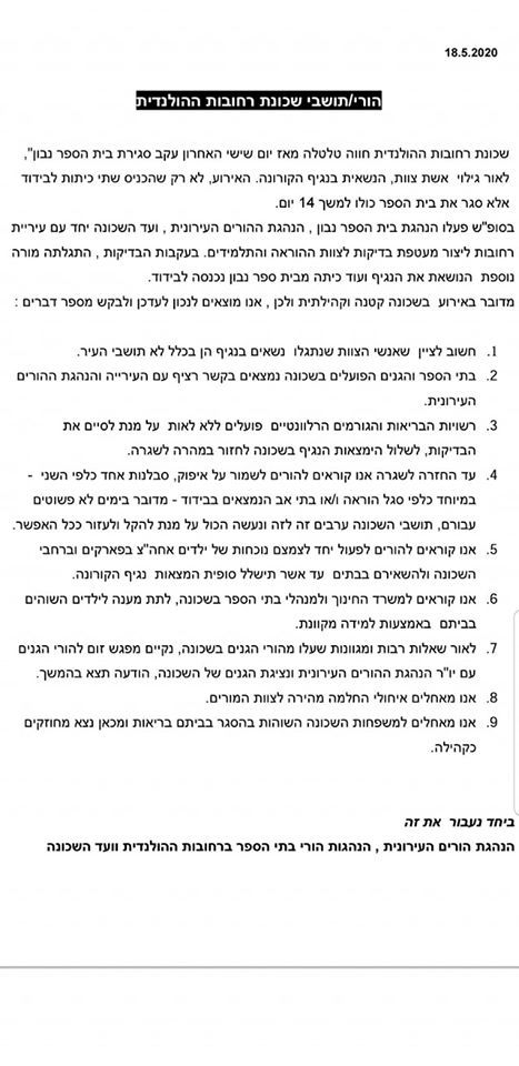 הודעת ועד ההורים וועד שכונת רחובות ההולנדית.