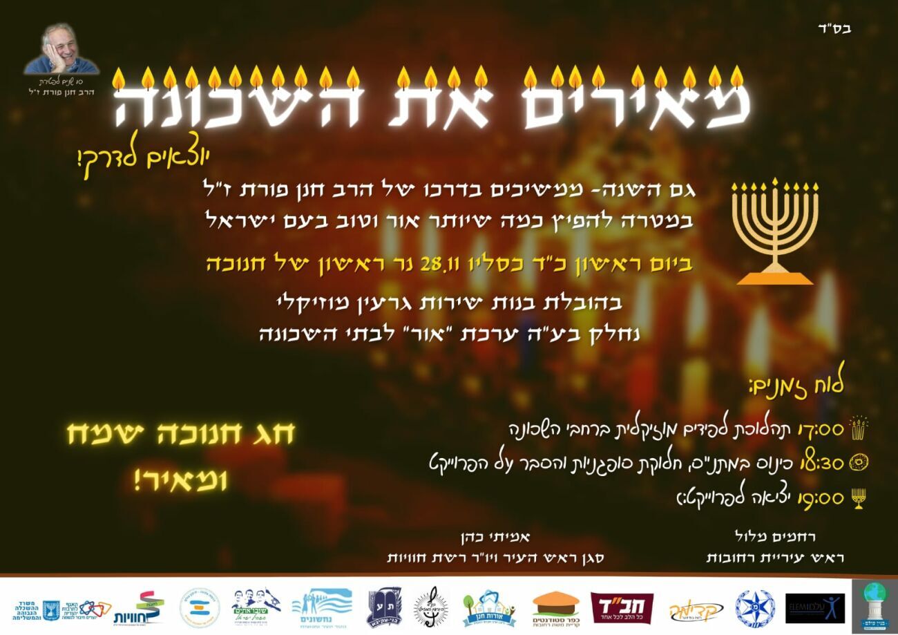 18:30 כינוס, הדלקת נרות מרכזית, חלוקת סופגניות ועוד הפתעות.