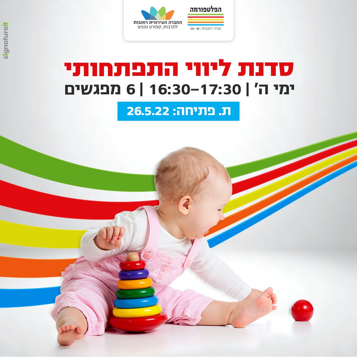 בפלטפורמה מזמינים אותך לסדנת ליווי התפתחותי של 6 מפגשים להורים ותינוקות, כאשר קבוצת הגיל תיפתח לפי הרוב המבוקש. בסדנה נלווה את התינוק בשלבי התפתחותו בדרך של חוויה מעניינת ואיכותית המשותפת להורה ולתינוק.