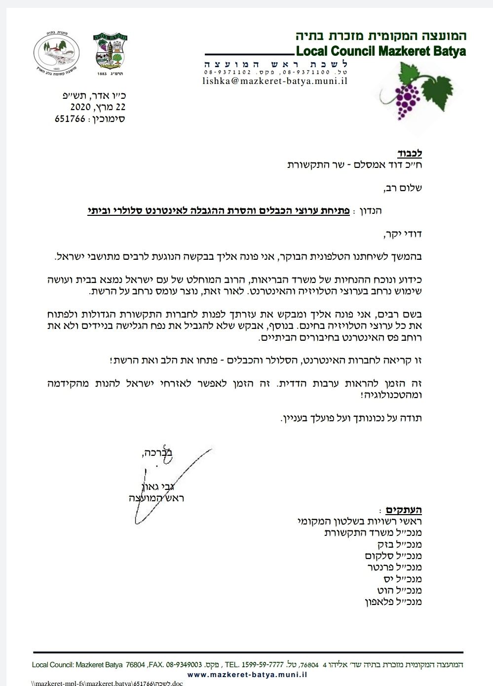 ראש המועצה, גבי גאון, שלח היום (ראשון) מכתב לשר התקשורת בו הוא מבקש ממנו לפנות לחברות תקשורת בסיוע לתושבים הנמצאים בבתים. לטענתו בתקופה זו גוברת צריכת האינטרנט והצפייה בטלויזיה בקרב התושבים הנמצאים בבתים, ולכן ביקש במכתבו כי חברות התקשורת יפתחו לתושבים את כל ערוצי הטלוויזיה בחינם וכן ביקש להפסיק בתקופה זו את הגבלת חבילות גלישת האינטרנט.