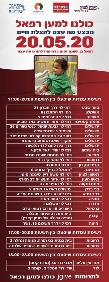 תושבים ממוצא תימני או שילוב תימני/צפון אפריקה יכולים להציל את רפאל בן השנה! היום רביעי (20.5) עד לשעה 20:00 יתקיים מבצע התרמה למח עצם ברחובות, ראשון לציון וקריית עקרון להצלת רפאל בן שנה , הבדיקה כוללת דגימת רוק בלבד. נקודות הבדיקה בכתבה