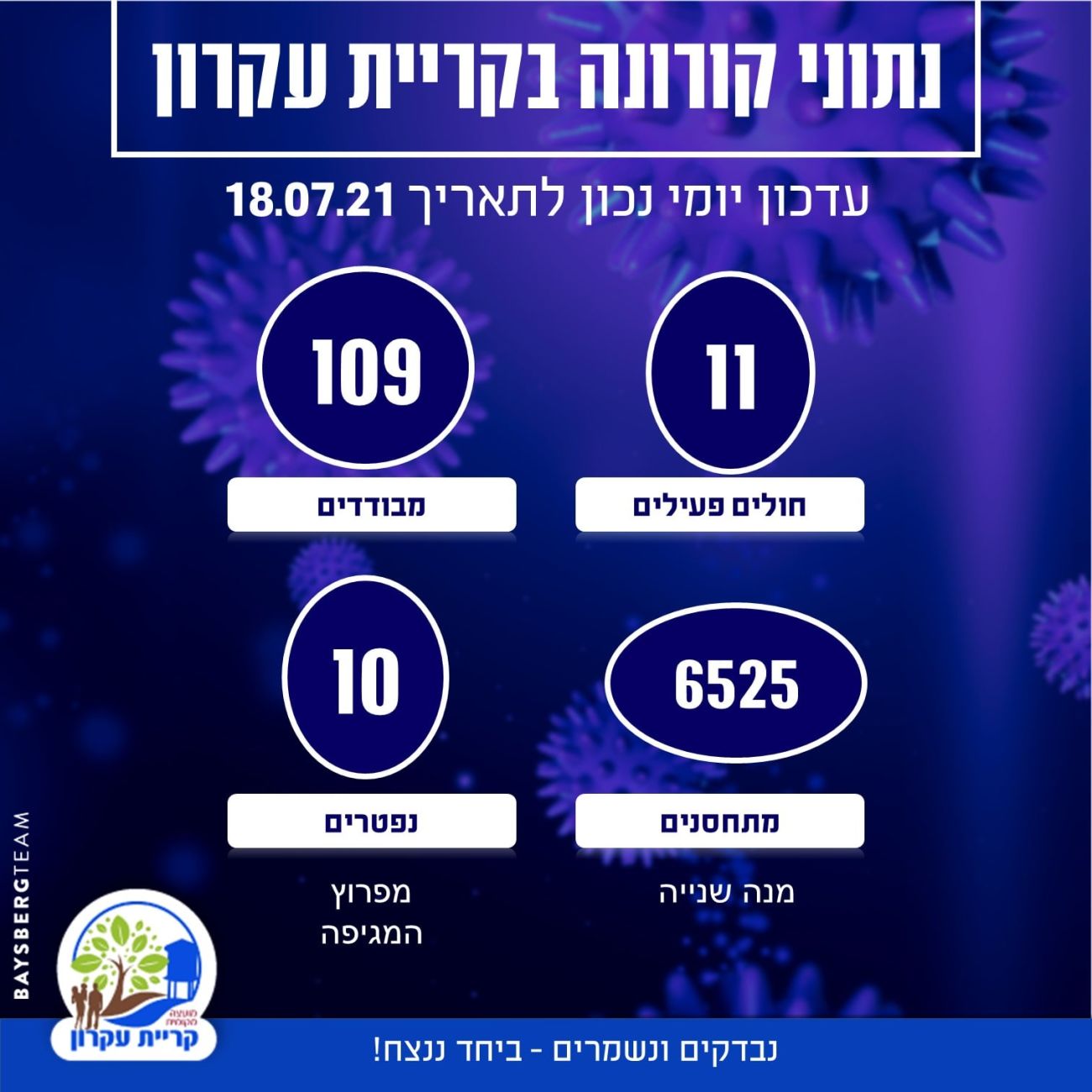 מבין ערי הסביבה קריית עקרון ומזכרת בתיה עדיין ירוקות עם כ15 חולים פעילים