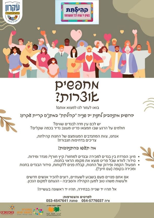 קהילת בקריית עקרון פותחת שנה ומחפשת מתנדבים ומתנדבות למגוון תפקידים משמעותיים בחנות הקהילתית החדשה
