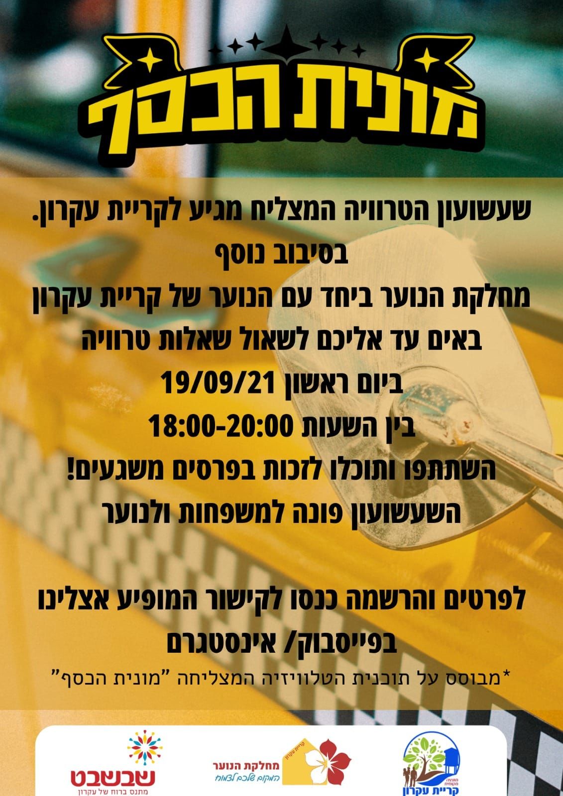 "מונית הכסף" של קריית עקרון חוזרת! הערב (ראשון 19.9) מוזמנות המשפחות להתמודד בשעשועון היישובי המגיע אליכם הביתה ולזכות בפרסים- יש לבצע הרשמה מראש