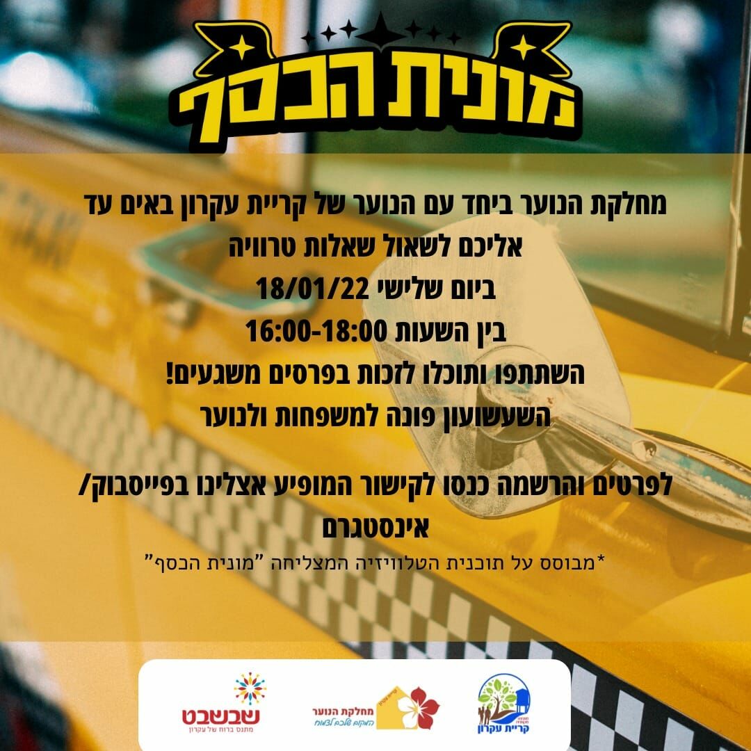 מחלקת הנוער בקריית עקרון מחזירה ליישוב את פעילות "מונית הכסף" - שעשועון טריוויה לכל המשפחה (המבוסס על תוכנית הטלוויזיה המוצלחת). ככל שתענו על יותר שאלות כך תקבלו פרסים יותר שווים (הזכייה בשעשועון הם רק בפרסים ולא בכסף).