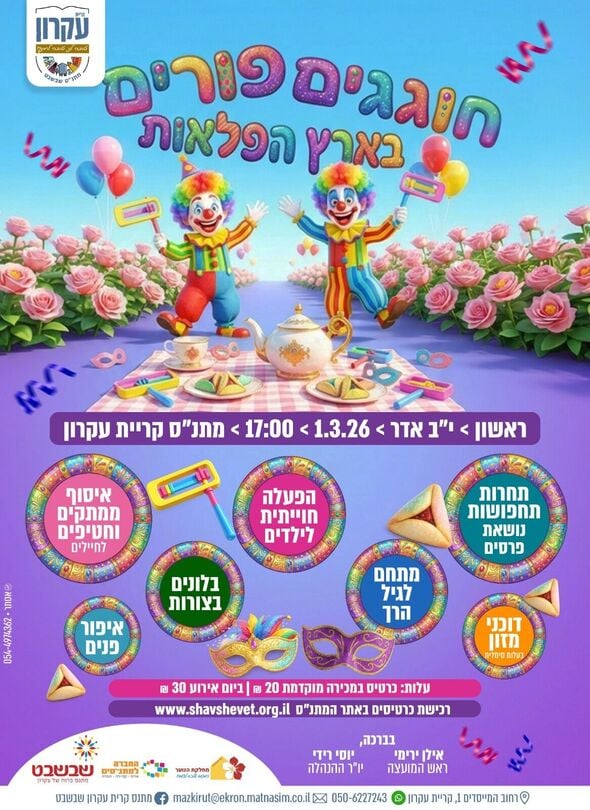 מתנ"ס קריית עקרון נערך לחגיגות פורים 2026 ומזמין את הציבור הרחב לשני אירועים חגיגיים שיתקיימו בתחילת חודש מרץ במתחם המתנ"ס.