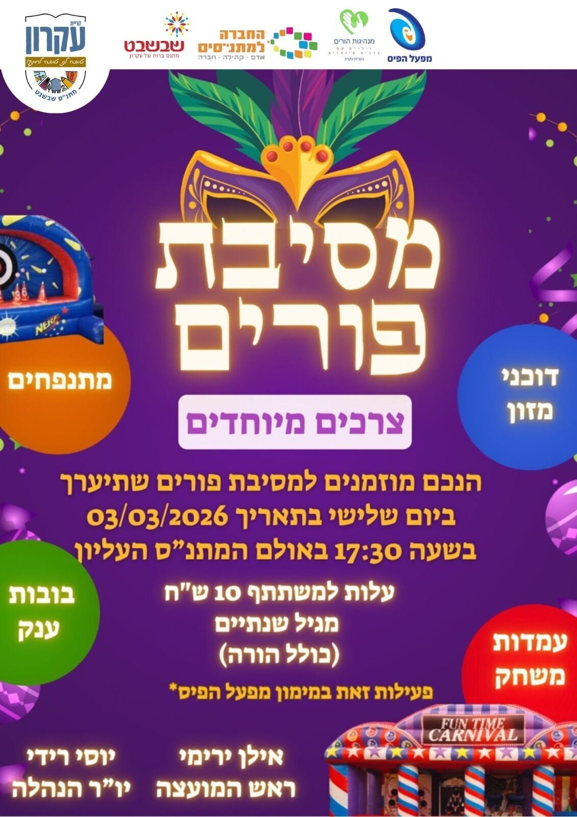 בנוסף, ביום שלישי, ה-3.3.26, בשעה 17:30, תתקיים במתנ"ס מסיבת פורים ייעודית למשפחות עם צרכים מיוחדים.