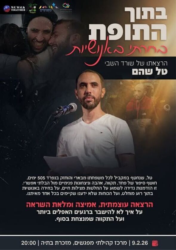 במהלך ההרצאה, יגולל שהם את סיפורה של משפחה שלמה שנחטפה לעזה, וישתף במסע המורכב של כאב, אהבה ותקווה שעברו - הן בשבי בעזה והן בחזרה בבית. המפגש מוגדר כהזדמנות לשמוע את הדברים ממקור ראשון, בלי פילטרים, ולצלול אל עומק הרגעים החשופים ביותר.