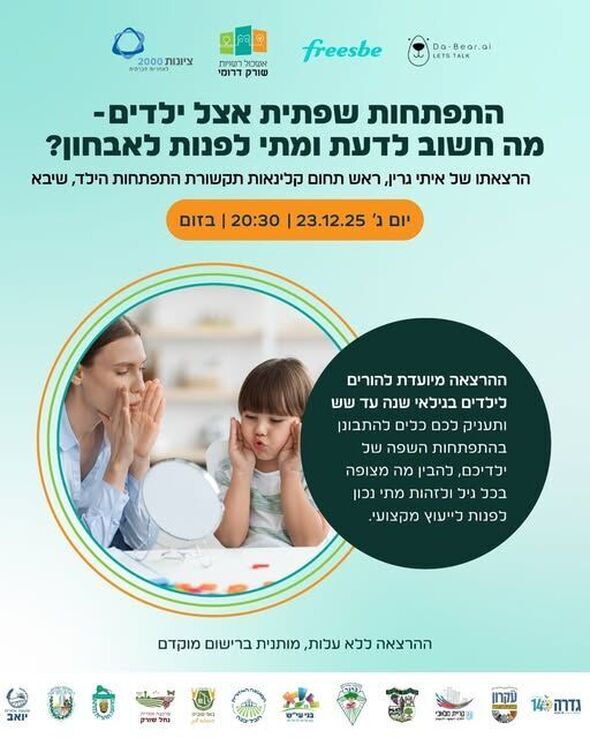 הרצאה להורים בנושא התפתחות שפה אצל ילדים בגיל הרך תתקיים בזום עבור תושבי אשכול שורק דרומי (גדרה, מזכרת בתיה וקריית עקרון) ביום שלישי 23.12