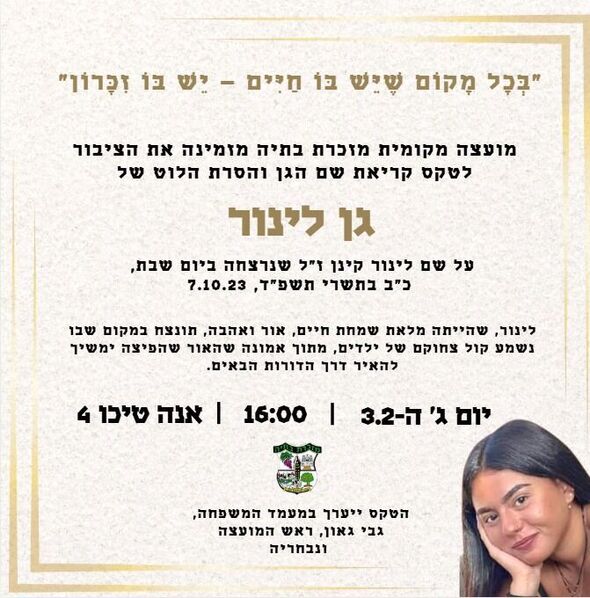 חנוכת "גן לינור" במזכרת בתיה לזכרה של לינור קינן ז"ל שנרצחה במסיבת הנובה יתקיים היום (שלישי ה-3.2)
