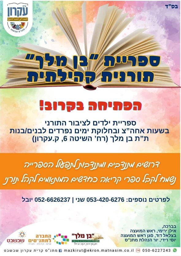 בקרוב בקריית עקרון: ספריית "בן מלך" חדשה תיפתח לציבור התורני; דרושים מתנדבים ומתנדבות לתפעול וכן תרומות של ספרי קריאה