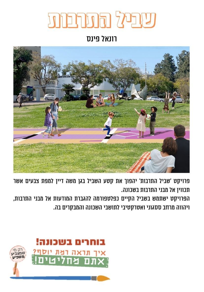 פרוייקט שביל התרבות, יהפוך את קטע השביל בגן משה דיין למפת צבעים אשר תכוון אל מבנה התרבות בשכונה. הפרוייקט ישתמש בשביל הקיים כפלטפורמה להגברת המודעות אל מבני התרבות ויהווה מרחב ססגוני ואטרקטיבי לתושבי השכונה והמבקרים בה.