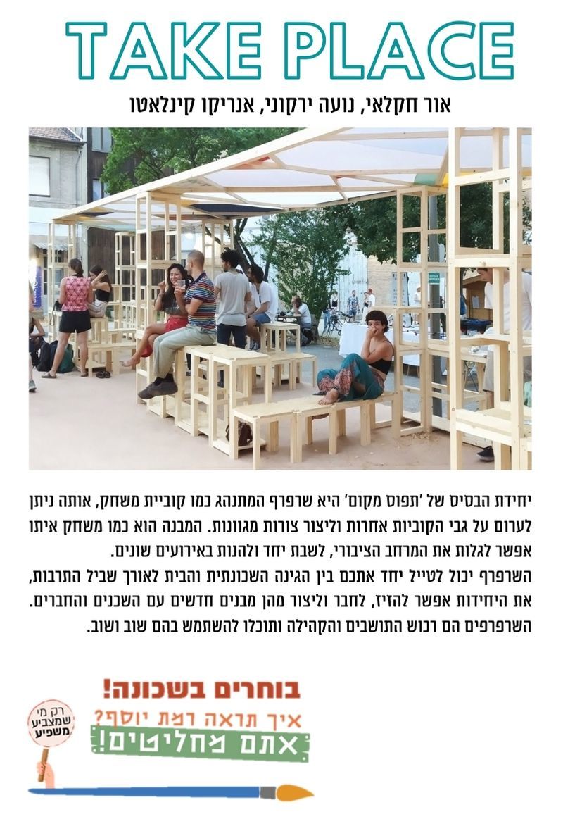 יחידת הבסיס של "תפוס מקום", היא שרפרף המתנהג כמו קוביית משחק, אותה ניתן לערום על גבי קוביות אחרות וליצור צורות מגוונות. המבנה הוא כמו משחק איתו אפשר לגלות את המרחב הציבורי, לשבת יחד וליהנות באירועים שונים. השרפרף יכול לטייל יחד אתכם בין הגינה השכונתית לבית ולאורך שביל התרבות. את היחידות אפשר להזיז, לחבר, וליצור מהן מבנים חדשים עם השכנים והחברים. השרפרפים הם רכוש התושבים והקהילה ותוכלו להשתמש בהם שוב ושוב.
