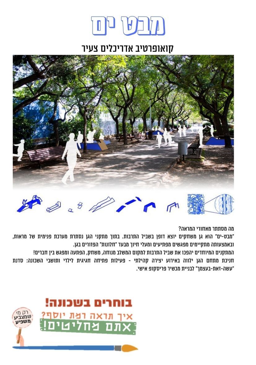 מבט ים הוא גן משחקים יוצא דופן בשביל התרבות. בתוך מתקני הגן נסתרת מערכת פנימית של מראות ובאמצעותה מתקיימים מפגשים מפתיעים ומעלי חיוך מבעד "לחלונות" הפזורים בגן. המתקנים המיוחדים יהפכו את שביל התרבות למקום המשלב מנוחה, משחק, הפתעה, ומרגש בין חברים. חניכת מתחם הגן ילווה באירוע יצירה קהילתי- פעילות פתיחה חגיגית לילדי ותושבי השכונה: סדנת "עשה זאת בעצמך" לבניית מכשיר פריסרופ אישי.