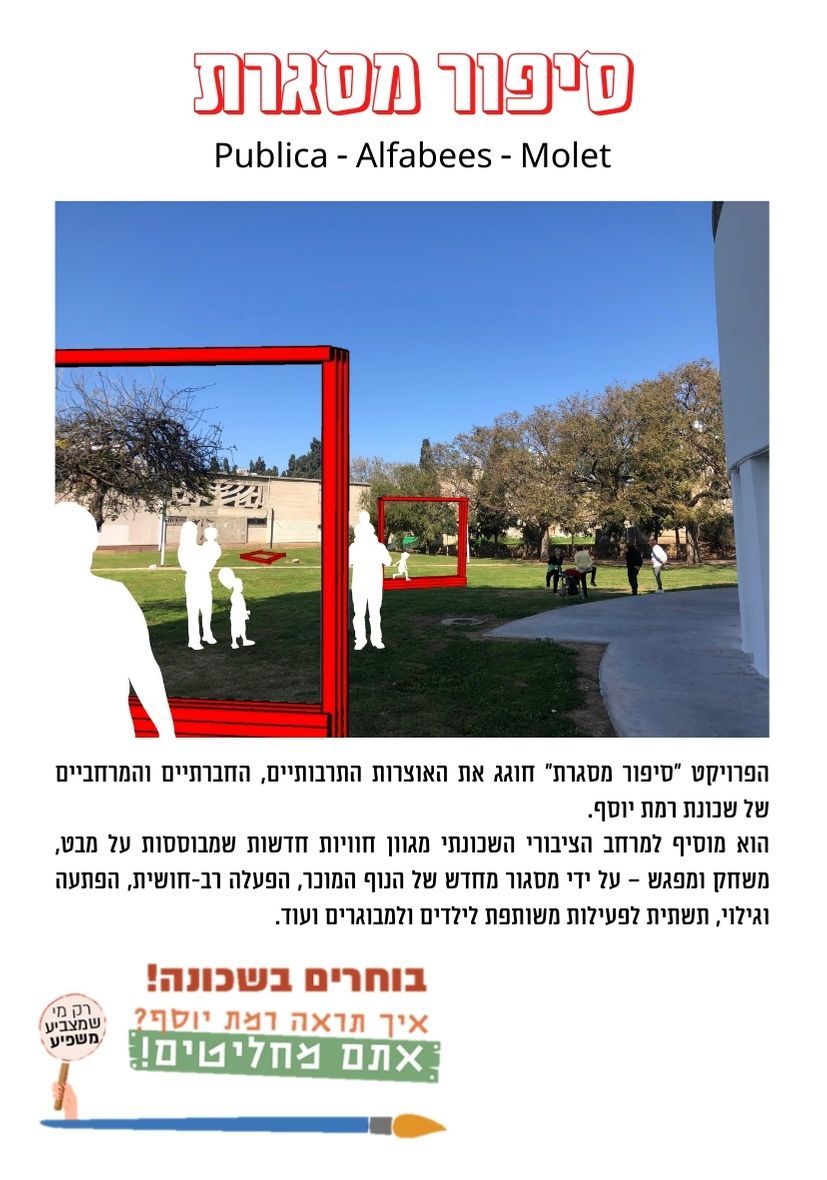 חוגג את האוצרות התרבותיים, החברתיים והמרחביים של שכונת רמת יוסף. הוא מוסיף למרחב הציבורי השכונתי מגוון חוויות חדשות שמבוססות על מבט, משחק ומפגש- על ידי מסגור מחדש של הנוף המוכר, הפעלה רב- חושית, הפתעה וגילוי, תשתית לפעילות משותפת לילדים ומבגרים ועוד.