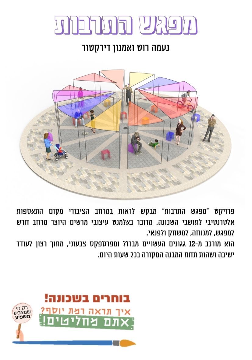 הפרוייקט מבקש לראות במרחב הציבורי מקום התאספות אלטרנטיבי לתושבי השכונה. מדובר באלמנט עיצובי מרשים היוצר מרחב חדש למפגש, למנוחה, למשחק ולפנאי. הוא מורכב מ12 גגונים העשויים מברזל ומפרספקס צבעוני, מתוך רצון לעודד ישיבה ושהות תחת המבנה המקורה בכל שעות היום.