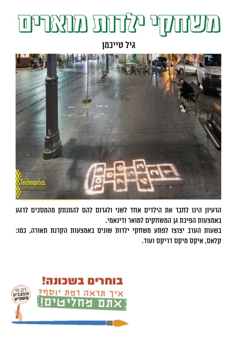 הרעיון הינו לחבר את הילדים אחד לשני ולגרום להם להתנתק מהמסכים לרגע באמצעות הפיכת גן המשחקים למואר ודינאמי. בשעות הערב יצוצו לפתע משחקי ילדות שונים באמצעות הקרנת תאורה כמו: קלאס, איקס מיקס דריקס ועוד.
