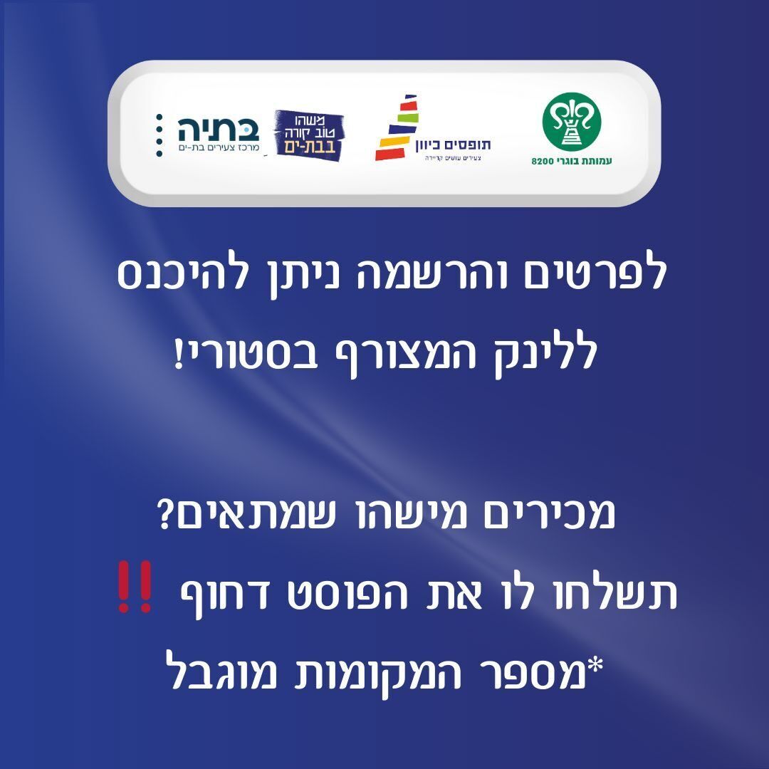 פרטים נוספים והרשמה לתוכנית ניתן למצוא בערוצי הדיגיטל של מרכז הצעירים "בתיה".