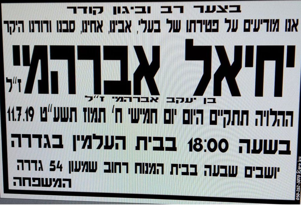 גדרה מרכינה את ראשה על פטירתו של איש החינוך ומנהל חט"ב נתיבי נעם לשעבר, יחיאל אברהמי שהלך לעולמו; הלוויתו תיערך היום(חמישי 11.7) בבית העלמין בגדרה