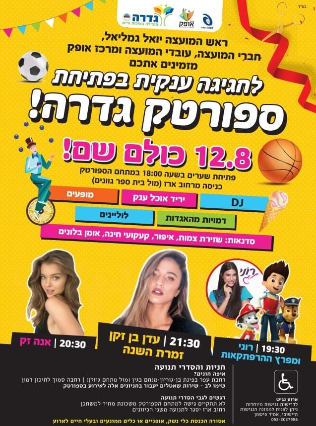 בשבוע הבא יתקיים אירוע פתיחת הספורטק החדש בגדרה כולל הופעות של עדן בן זקן ואנה זק. בהמשך השבוע יופיעו הזמרות מרגלית צנעני ושירי מימון והפתעות נוספות ממתינות לתושבים לסיום הקיץ.