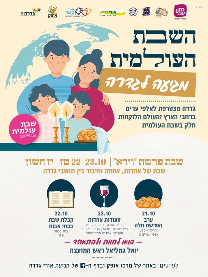 השבת העולמית מגיעה לגדרה! החל מהיום (חמישי 21.10) יחלו אירועי השבת העולמית בגדרה עם אירוע הפרשת חלה, קבלת שבת בבתי אבות, סעודות אחדות וקהילתיות ועוד
