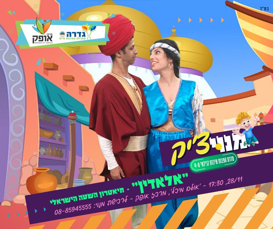 ההצגה "אלאדין", עיבוד של תיאטרון השעה הישראלי לסיפור המוכר והאהוב על אלדין, יסמין והג'יני כמובן. ההצגה במסגרת "מנויצ'יק", סדרת הצגות איכות לגילאי 4-8, ופתוחה גם לקהל הרחב במחיר מיוחד של 25 ₪.