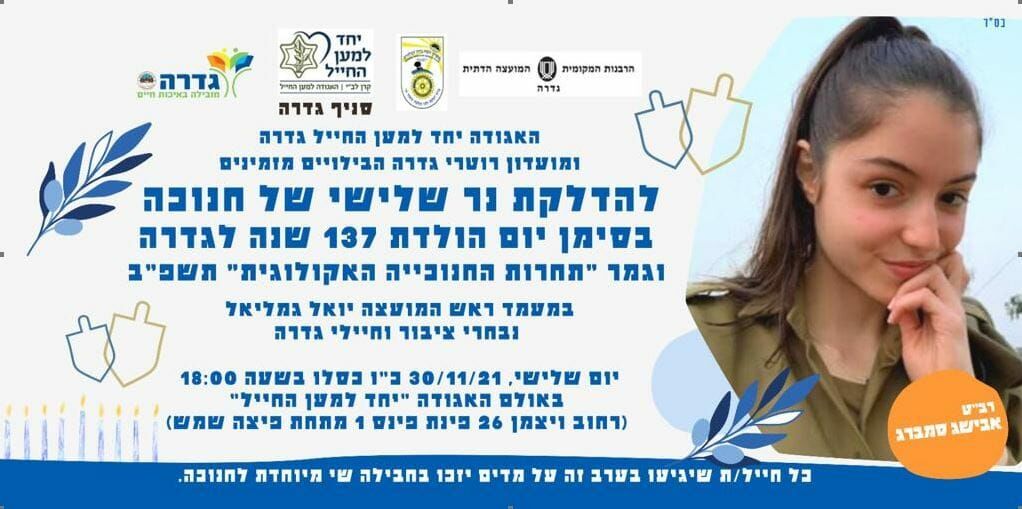 טקס הדלקת נרות חנוכה של האגודה יחד למען החייל ומועדון רוטרי הבילויים בסימן יום הולדת 137 לגדרה וגמר תחרות החנוכייה האקולוגית. האירוע יתקיים במעמד ראש המועצה יואל גמליאל והמדליסטית האולימפית, אבישג סמברג.