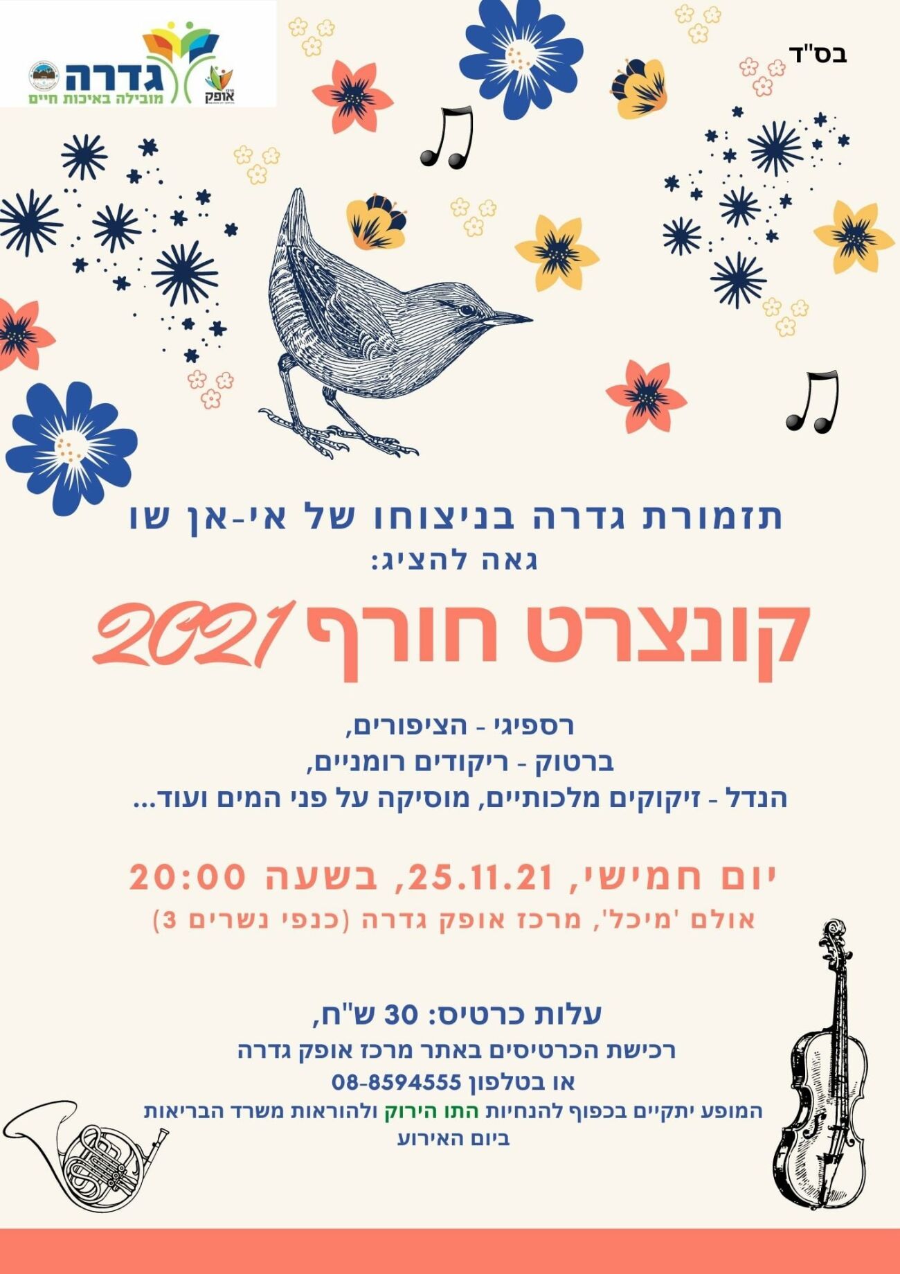 את אירועי החג פותחת תזמורת החובבים של גדרה בניצוחו של מאסטרו אי-אן שו, התזמורת פועלת זו השנה השלישית והחלה את דרכה במיזם הבתים המוארים של מרכז אופק שם התגבש הגרעין של התזמורת ואם עד היום לא שמעתם אותם, אתם חייבים. הקונצרט הקרוב הנושא את השם "קונצרט חורף" תנגן התזמורת את היצירות: הציפורים מאת רספיגי, ריקודים רומניים מאת ברטוק ומוזיקה על פני המים וזיקוקים מלכותיים מאת הנדל.