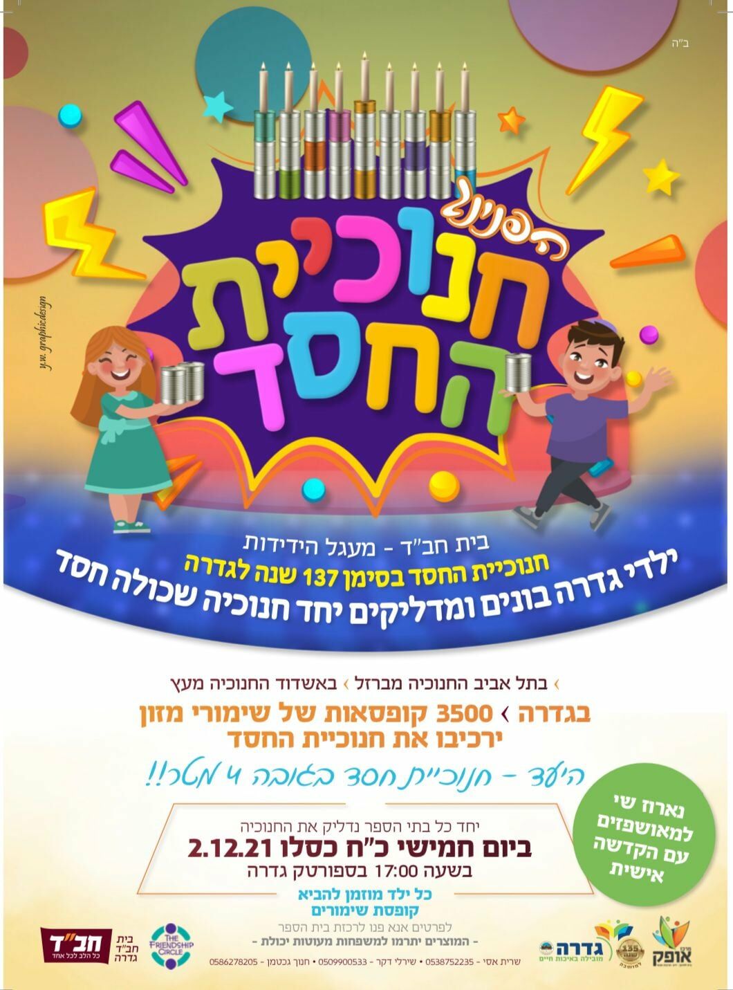 עוד באותו היום בספורטק, חנוכיית החסד הארוע המסורתי והמרגש בהובלת חב"ד גדרה, שמשלב את מצוות הדלקת נר של חנוכה ומעשה חסד באריזת חבילות למשפחות נזקקות.