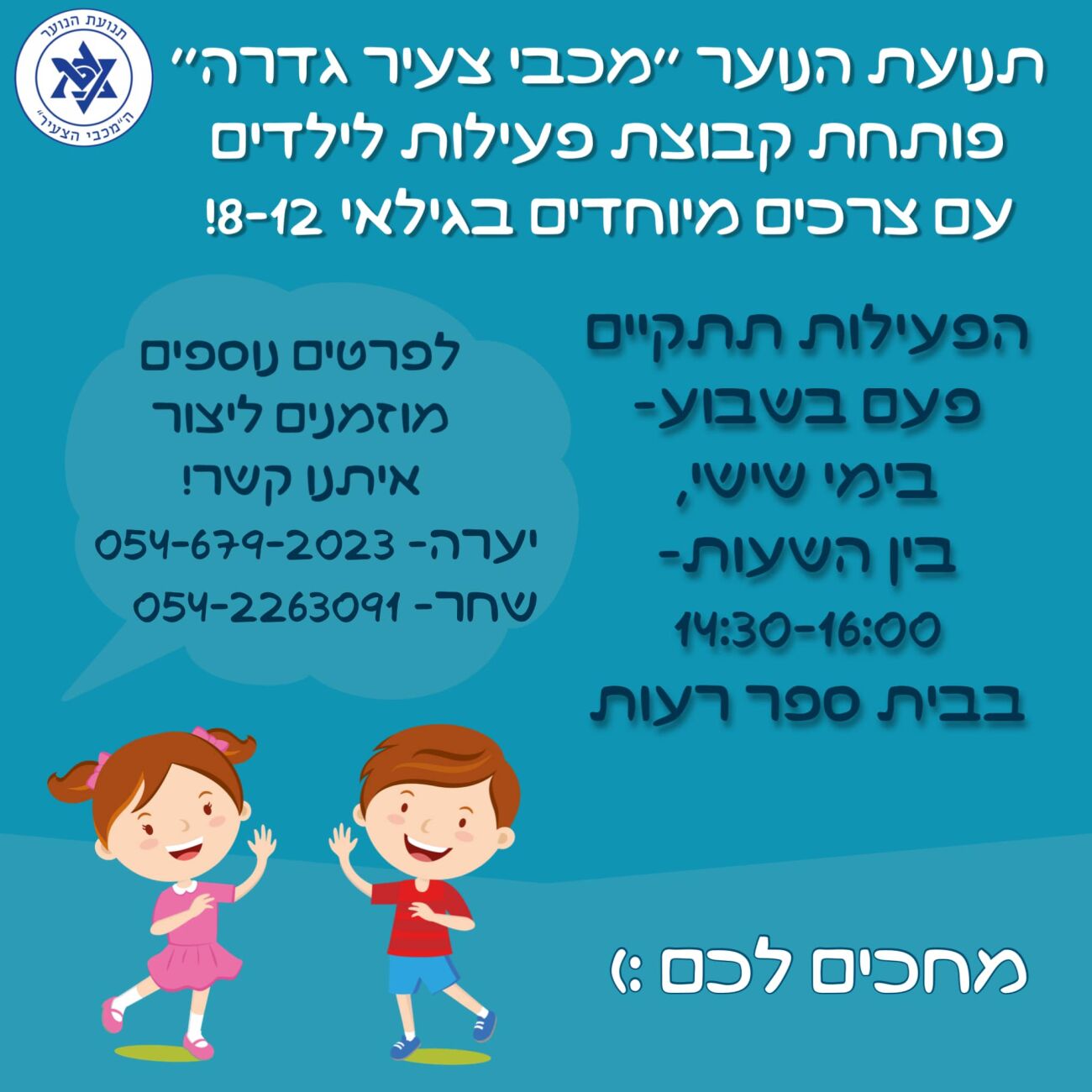 תנועת הנוער מכבי צעיר גדרה מרחיבה את פעילותה למען ילדי גדרה ובימים אלו פותחת קבוצת פעילות חדשה לילדים עם צרכים מיוחדים בני 8-12.