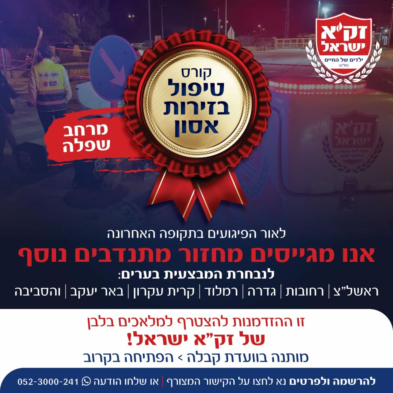 לאור העלייה בפיגועים! ארגון זק"א ישראל מגייס מתנדבים חדשים למערך המתנדבים בראשון לציון, רחובות, גדרה, קריית עקרון והסביבה במסגרת קורס לטיפול בזירות אסון לפרטים והרשמה בוואטסאפ 052-3000241
