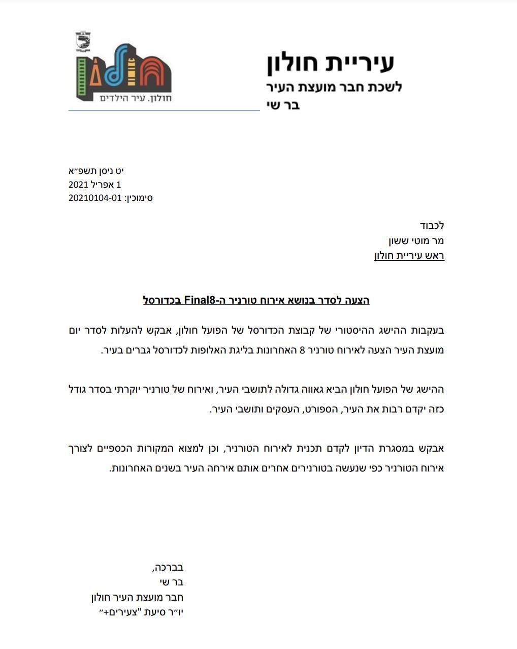 חברי סיעת הצעירים חולון הגישו הצעה לסדר לאירוח שלב רבע גמר ליגת האליפות של פיב"א בעיר לאור העפלתה של קבוצת הכדורסל הפועל חולון לפיינל 8