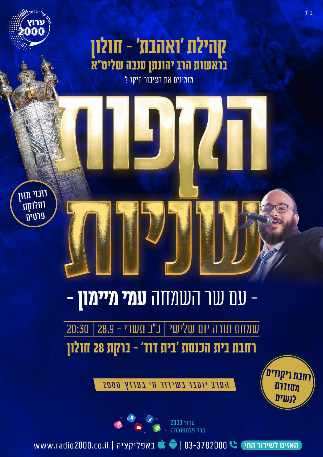 הקפות שניות! בתי הכנסת בחולון מזמינים את הציבור להקפות שניות במספר בתי כנסת שונים בעיר במוצאי שמחת תורה.