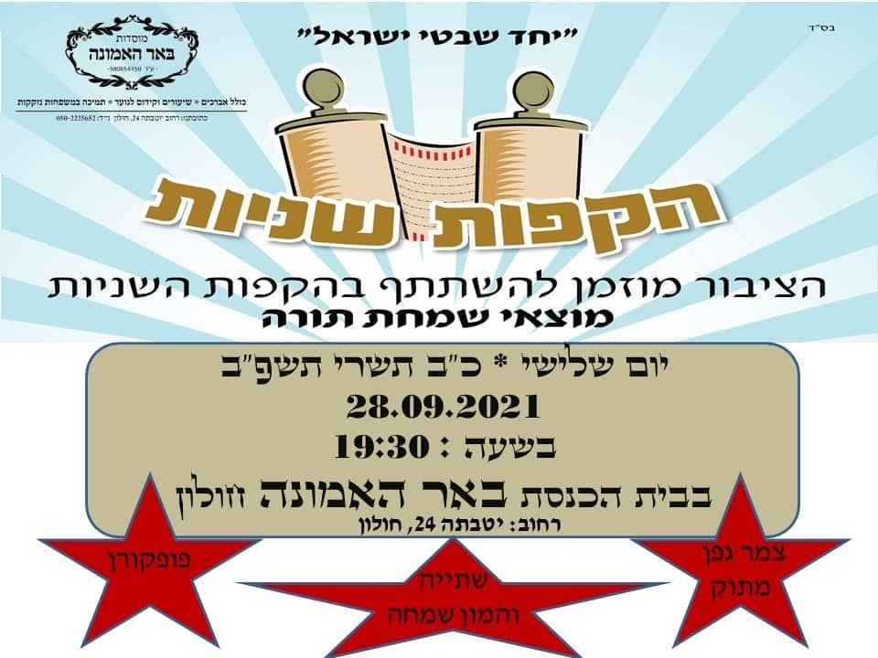 בתי הכנסת בחולון מזמינים את הציבור הרחב להקפות שניות ביום שלישי ה28.9 , צאת שמחת תורה
