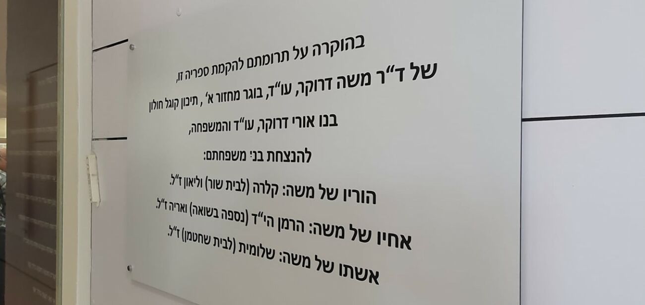 חידוש הספרייה התאפשר הודות לתרומתו הנדיבה של ד"ר משה דרוקר, בוגר מחזור א' של בית הספר, שסיים את לימודיו בשנת 1952. דרוקר, בעליו של משרד עורכי-דין, שכיהן בעבר גם כחבר מועצת העיר, תרם יחד עם בנו, עו"ד אוֹרי דרוקר, 350,000 ₪ לזכר בני משפחתם. בנוסף, התקבלה תרומה מקרן גוטסמן בשיתוף עיריית חולון. ד"ר דרוקר נשא באירוע דברים מרגשים ושיתף את הנוכחים בסיפור חייו המרתק ובסיבות לרצונו להנציח את בני משפחתו האהובים שאינם בחיים. בחלק האומנותי הופיעה להקת בית הספר.