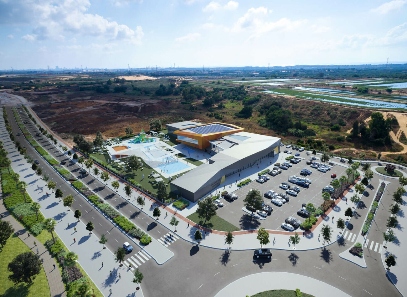המרכז, בשטח של 12,000 מ""ר כולל בריכות פנאי חיצוניות, מתקן מגלשות ומבנה בשטח של כ-6,200 מ"ר הכולל חדר כושר, בריכה מקורה, חדרי פעילות, ספא, בריכה טיפולית, מלתחות, בית קפה, מנהלה וחזית מסחרית לרחוב.